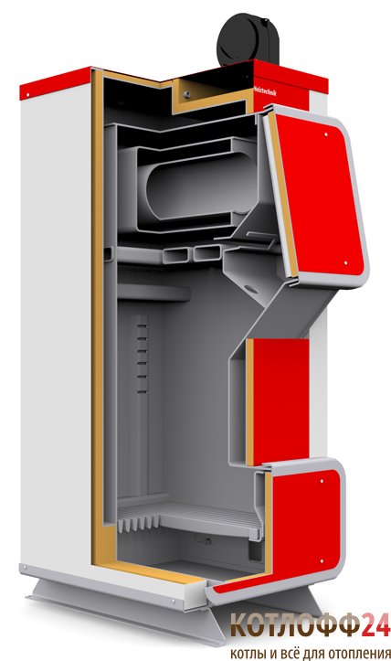 Топка котла оснащена системой вторичного наддува воздуха, что дает возможность эффективно сжигать различные виды топлива, например, таких как уголь с высоким содержанием пыли или дров. Отличительной особенностью данного котла также является большая загрузочная дверь, расположенная под наклоном, что упрощает загрузку топлива и обслуживание котла, а также повышает качество сгорания.